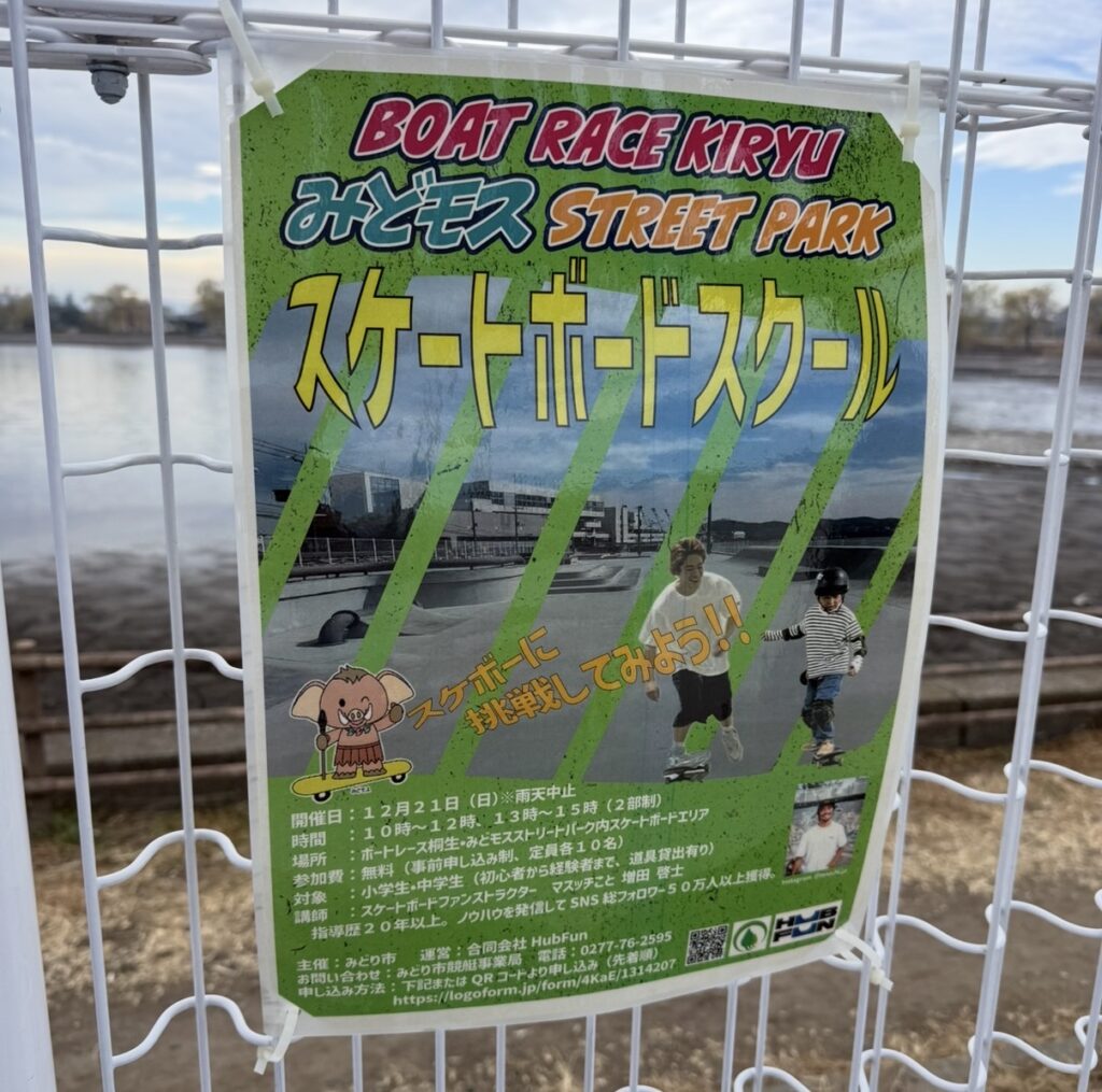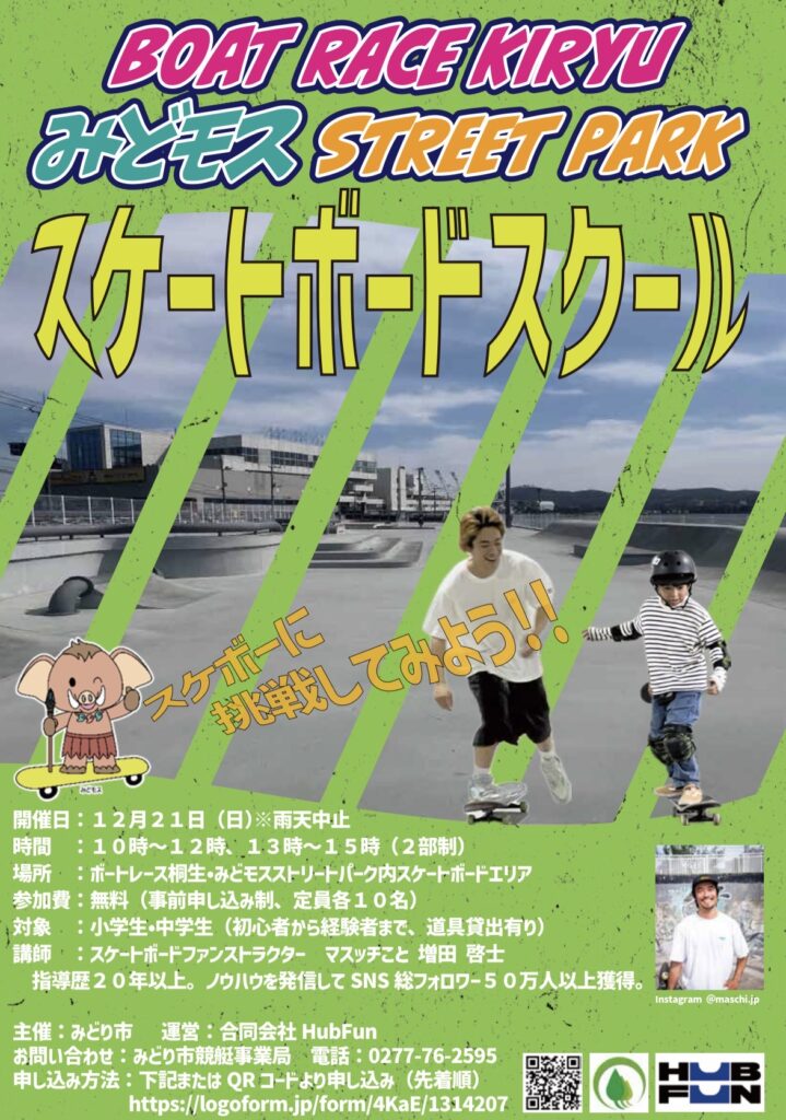 群馬県みどり市にある みどモスストリートスポーツパーク(ボートレース桐生内)にて、 小学生・中学生を対象としたスケートボードスクールを実施しました。