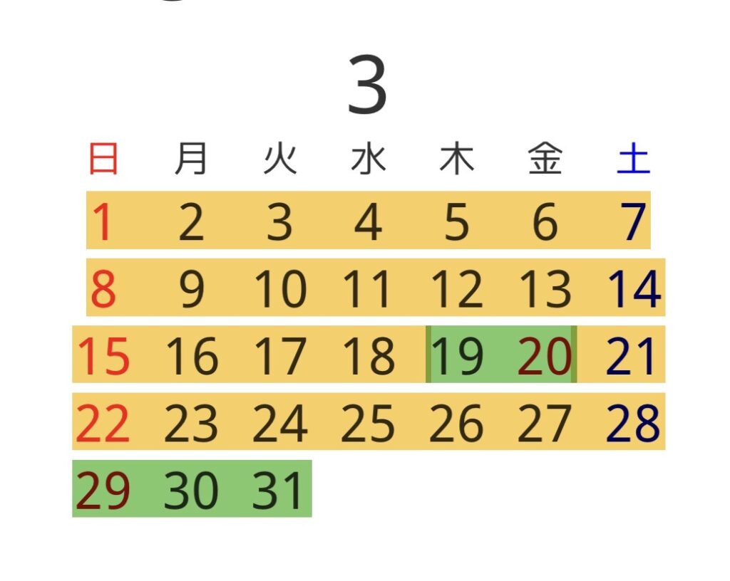 緑色が休講日、オレンジ色がスクール実施日になります。